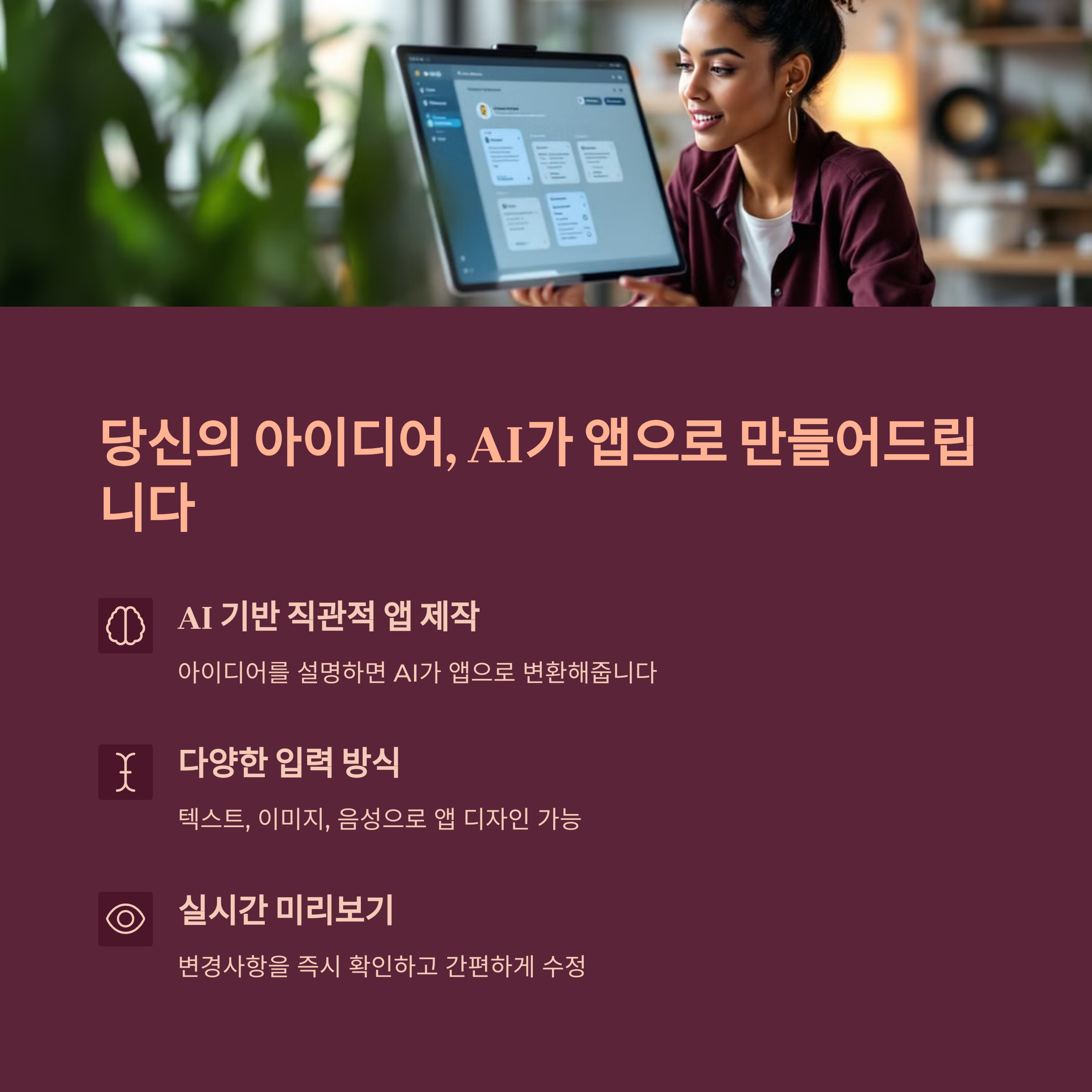 텍스트 입력은 물론, 이미지와 음성 입력까지 다양하게 지원해 사용자가 편리하게 원하는 앱을 제작할 수 있습니다.