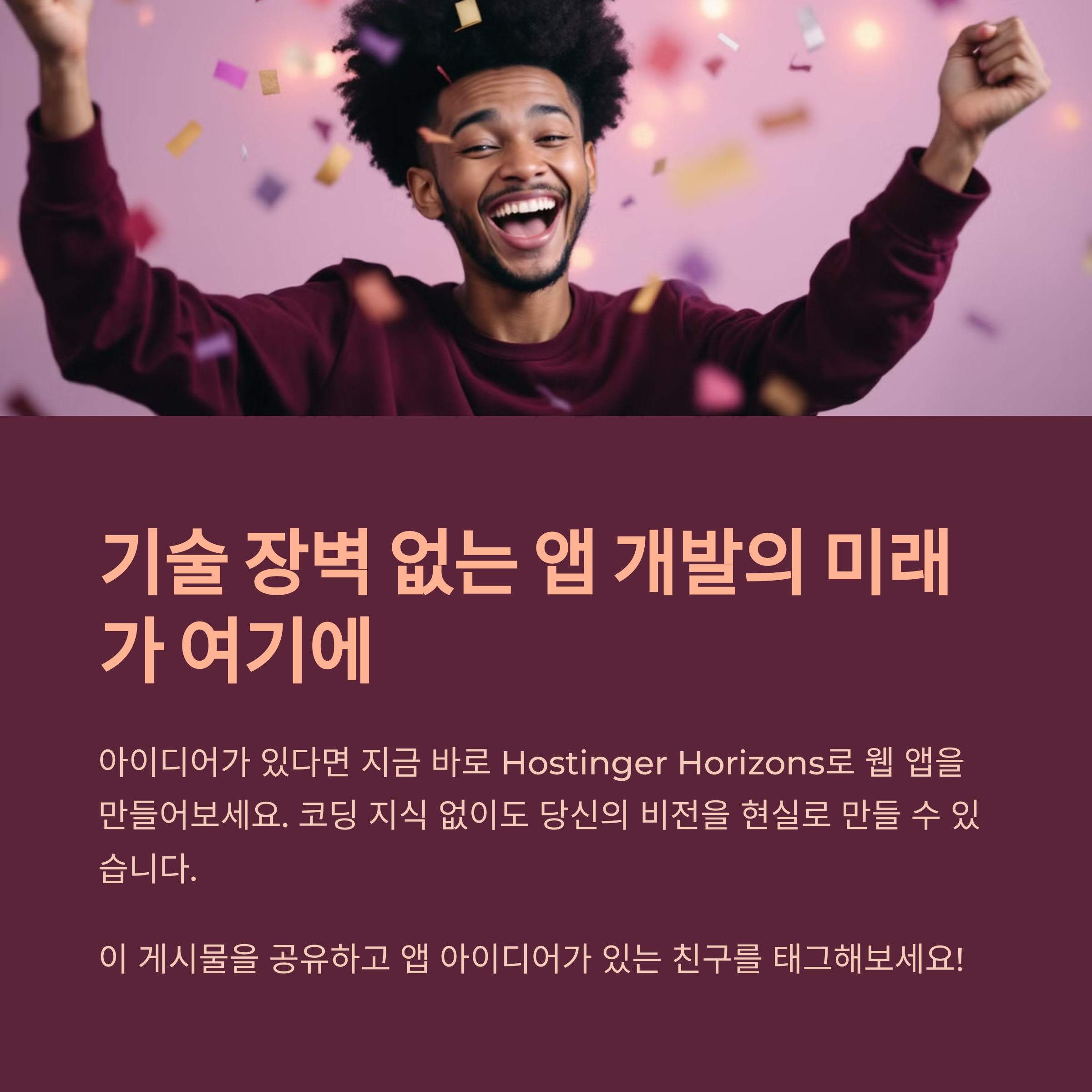 아이디어만 있다면, 클릭 한 번으로 나만의 웹 앱을 만들 수 있는 세상! 지금, Hostinger Horizons가 그 문을 열어줍니다.