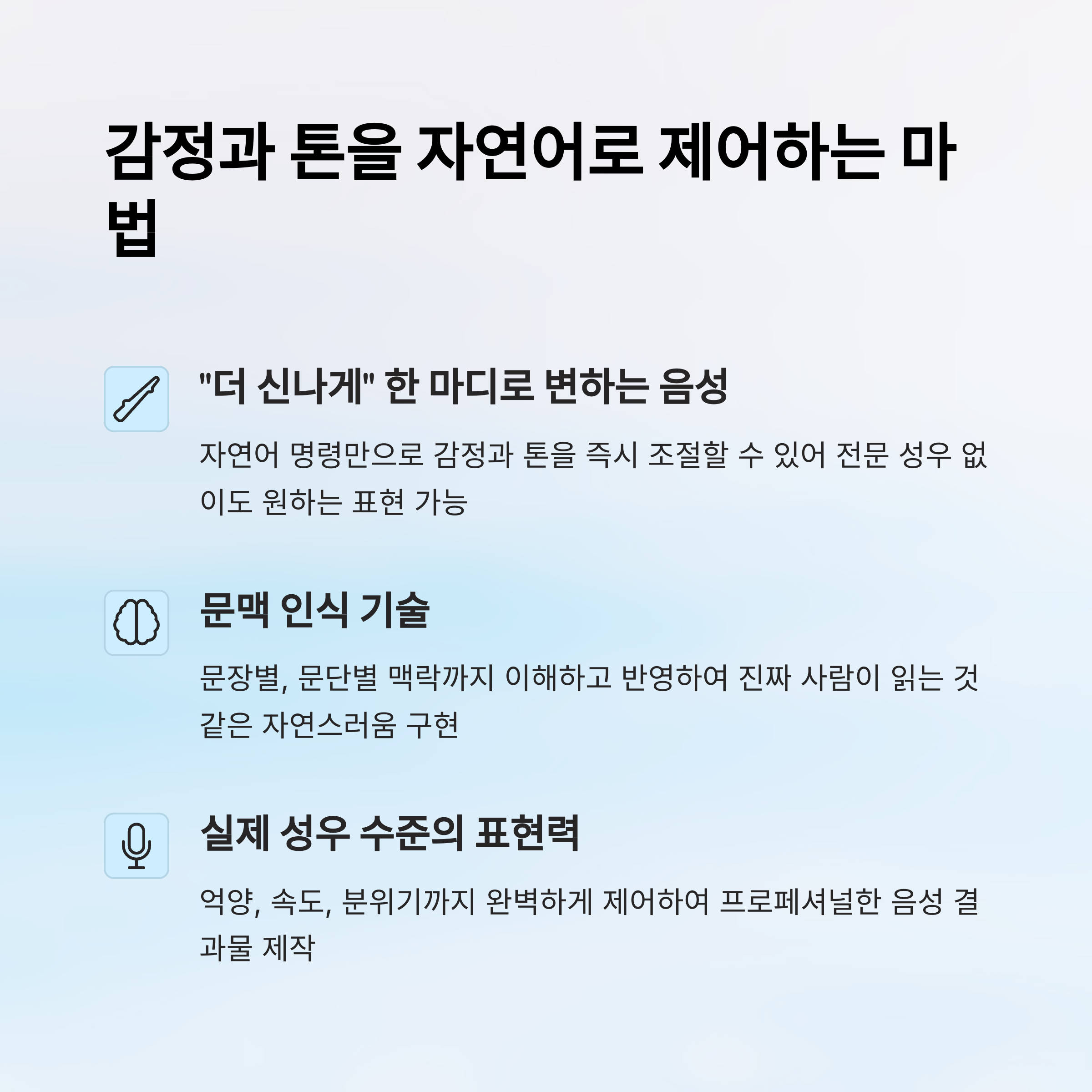 | 감정 표현 | "더 슬프게", "비꼬듯" 같은 지시어로 감정 조절 가능 |