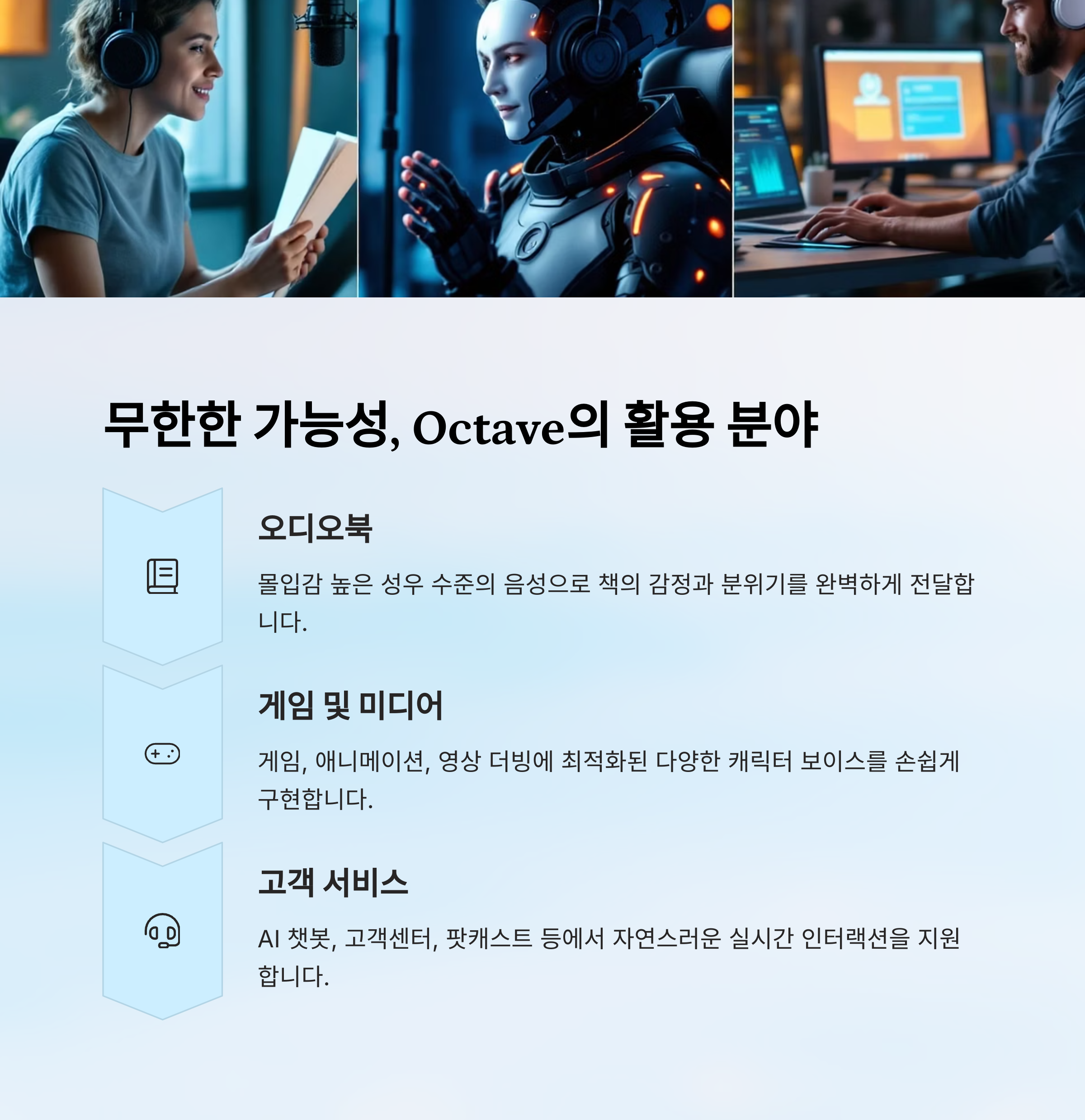 Octave는 다양한 분야에서 활용될 수 있어요. 단순한 음성 안내를 넘어, 진짜 사람처럼 공감하고 이야기하는 느낌을 줄 수 있거든요.