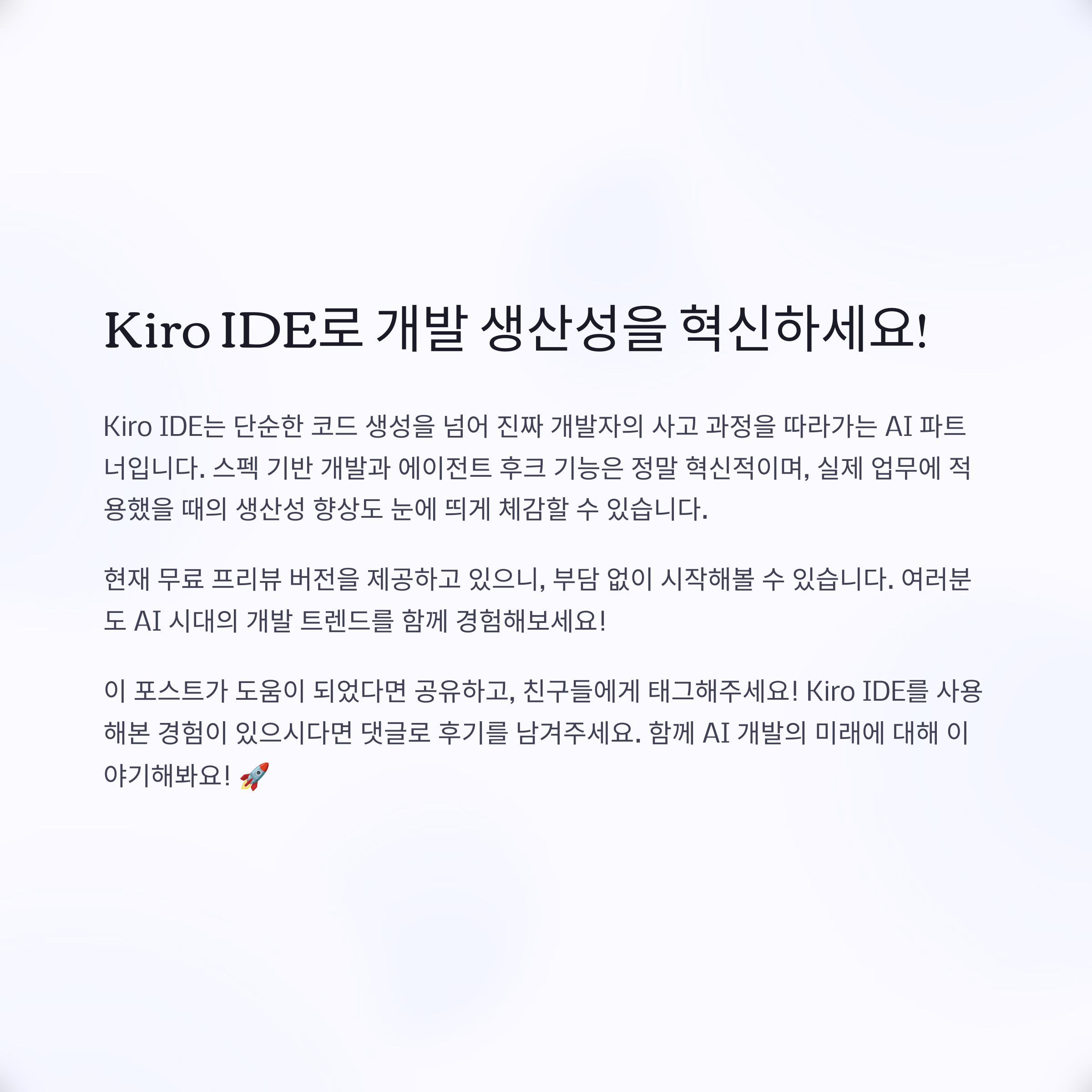 여러분도 Kiro를 한번 체험해보시길 추천드려요! 현재 무료 프리뷰 버전을 제공하고 있으니까, 부담 없이 시작해볼 수 있거든요. 혹시 사용해보신 분이 계시다면 댓글로 후기 공유해주세요. 궁금한 점이나 다른 AI 개발 도구와 비교하고 싶은 내용이 있다면 언제든 문의해주시고요. 함께 AI 시대의 개발 트렌드에 대해 이야기 나눠봐요!
