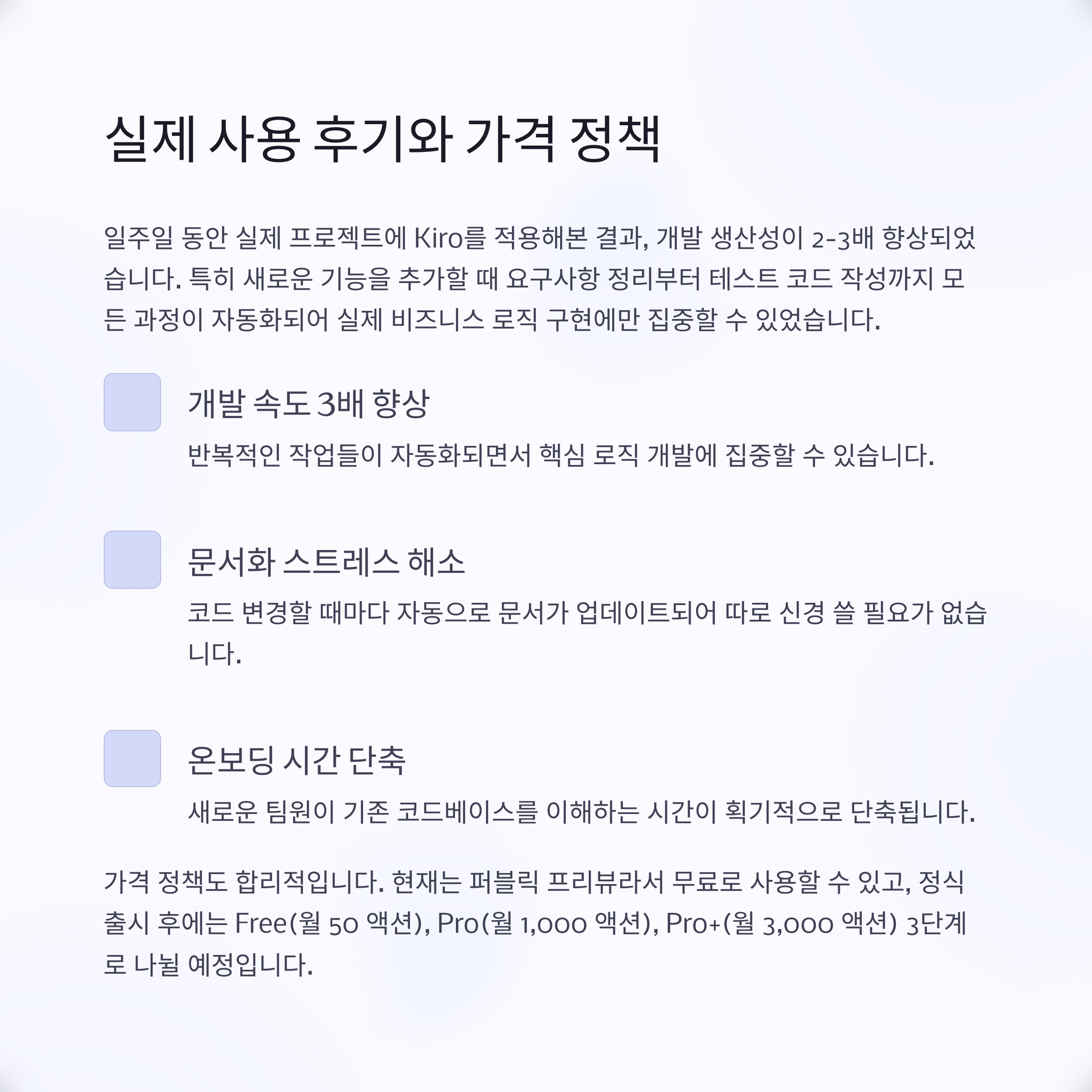 일주일 동안 실제 프로젝트에 Kiro를 적용해본 결과를 솔직하게 말씀드릴게요. 정말 개발 생산성이 2-3배는 올라간 것 같아요. 특히 새로운 기능을 추가할 때 요구사항 정리부터 테스트 코드 작성까지 모든 과정이 자동화되니까, 실제 비즈니스 로직 구현에만 집중할 수 있더라고요.