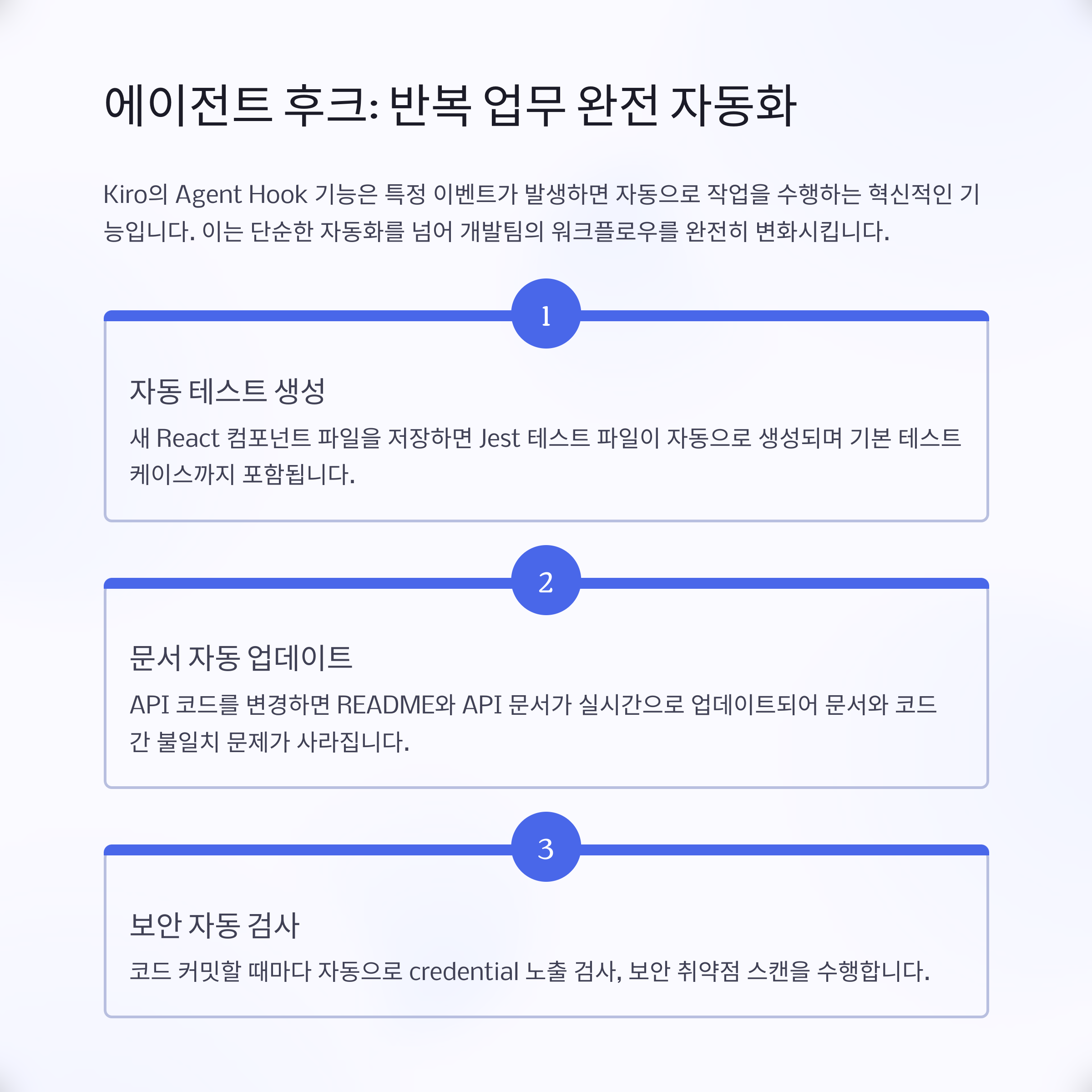 Kiro의 Agent Hook 기능은 정말 혁신적이에요. 특정 이벤트가 발생하면 자동으로 작업을 수행하는 건데, 이게 단순한 자동화를 넘어서 진짜 개발팀의 워크플로우를 완전히 바꿔놓더라고요. 더 이상 "아, 또 테스트 파일 만들어야 해" 같은 생각 안 해도 돼요.