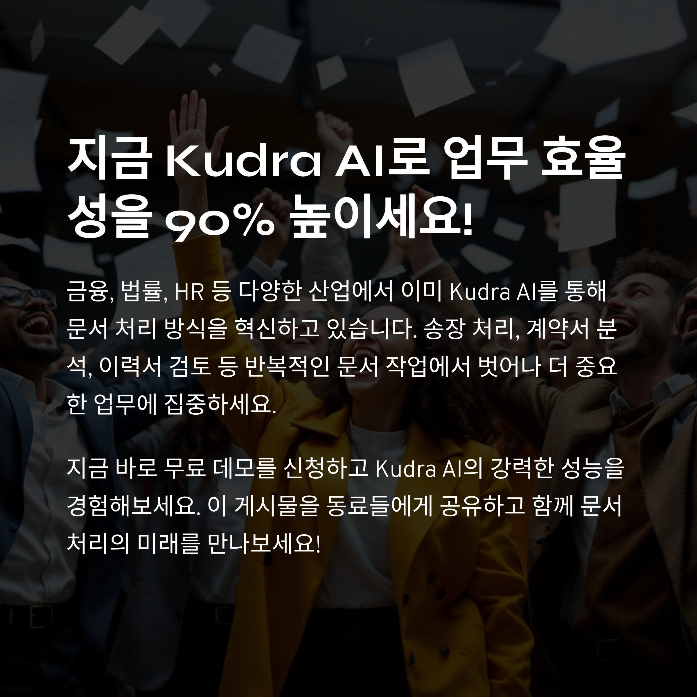 지금까지 Kudra AI의 다양한 기능과 실제 적용 사례를 살펴보셨는데요, 어떠셨나요? 솔직히 말하면 저도 처음엔 반신반의했어요. 근데 몇 주 써보니까, 문서 작업에 쓰던 시간이 반 이상 줄어든 거 있죠? 특히나 반복 작업이 많거나, 데이터 정확도가 중요한 팀이라면 Kudra는 정말 게임 체인저예요. 문서 자동화, 이제는 선택이 아닌 필수입니다. 여러분도 꼭 한 번 체험해보시고, 업무 효율화의 신세계를 경험해보시길 바라요!