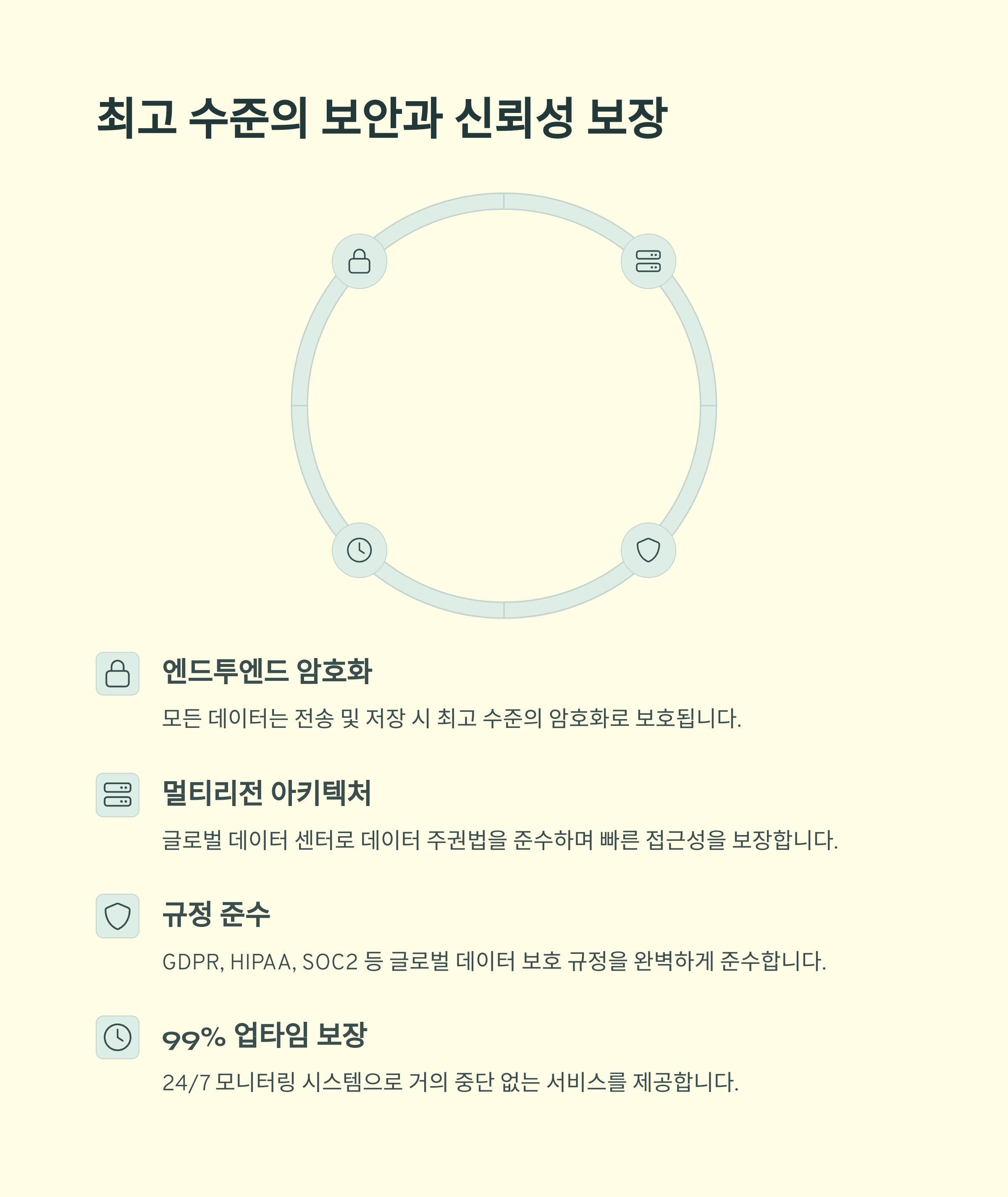Kudra AI는 엔드 투 엔드 암호화, 접근 제어, 감사 로그 등 다양한 보안 기능을 통해 기업 데이터 보호에 만전을 기합니다.