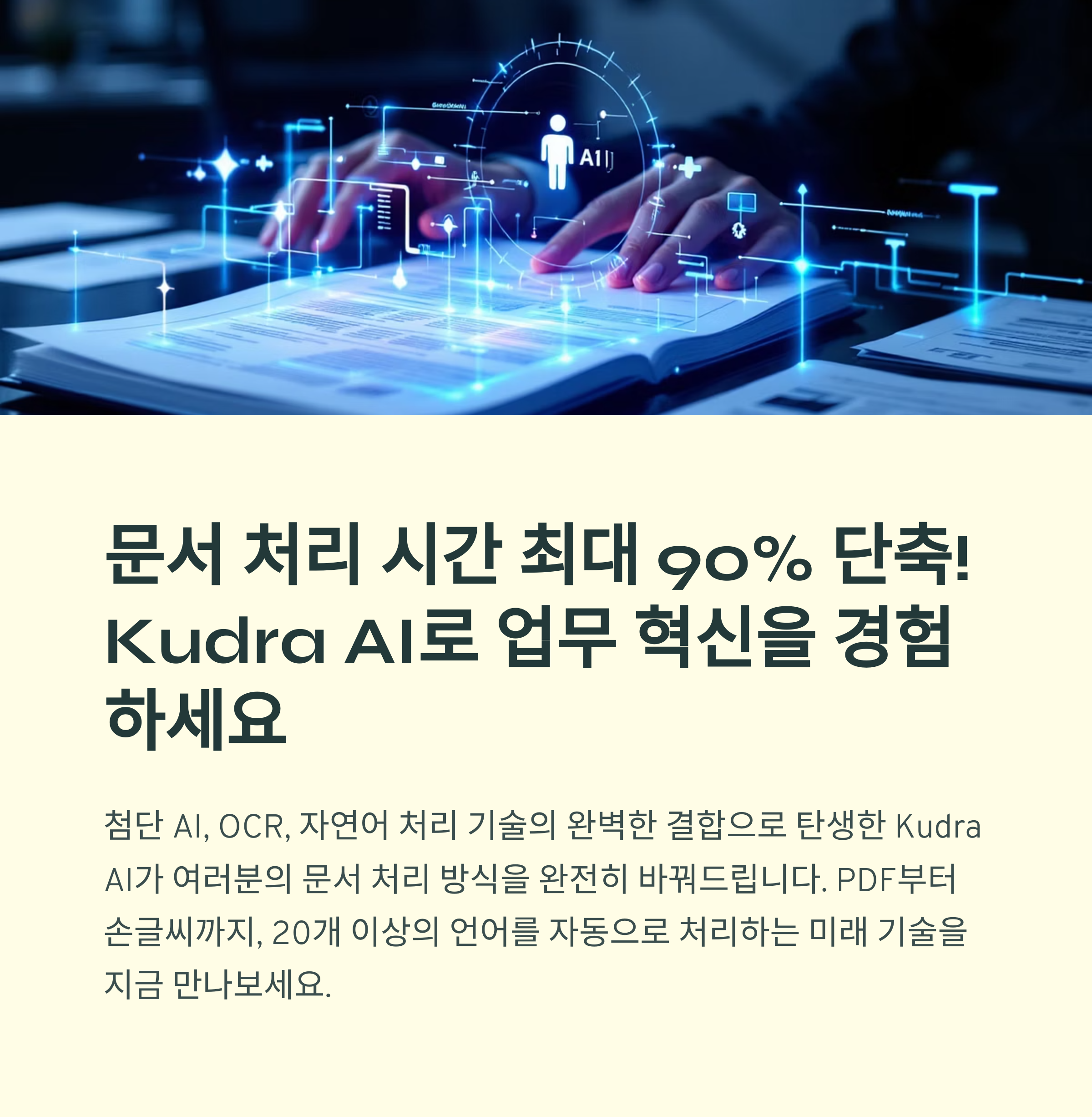 지금까지 Kudra AI의 다양한 기능과 실제 적용 사례를 살펴보셨는데요, 어떠셨나요? 솔직히 말하면 저도 처음엔 반신반의했어요. 근데 몇 주 써보니까, 문서 작업에 쓰던 시간이 반 이상 줄어든 거 있죠? 특히나 반복 작업이 많거나, 데이터 정확도가 중요한 팀이라면 Kudra는 정말 게임 체인저예요. 문서 자동화, 이제는 선택이 아닌 필수입니다. 여러분도 꼭 한 번 체험해보시고, 업무 효율화의 신세계를 경험해보시길 바라요!