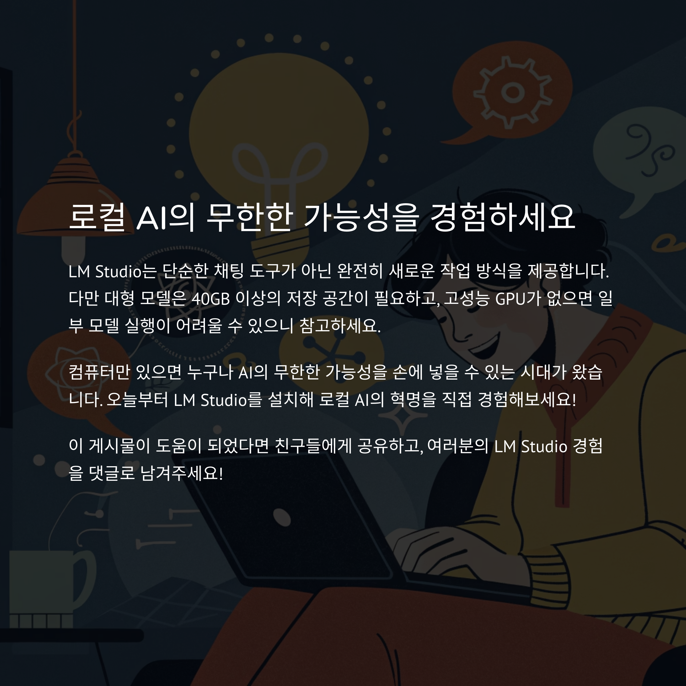 로컬에서 LLM을 실행한다는 게 상상만 했던 일이었는데, 이제는 현실이 되었어요. LM Studio 덕분에 저도 완전히 새로운 작업 방식을 경험하고 있습니다. 컴퓨터만 있으면 누구나 AI의 무한한 가능성을 손에 넣을 수 있는 시대, 진짜 멋지지 않나요? 여러분도 오늘부터 한번 설치해보시고 직접 느껴보시길 강력 추천드려요. 궁금한 점이 있다면 댓글로 남겨주시고, 이 글이 도움이 되셨다면 공유도 부탁드릴게요!