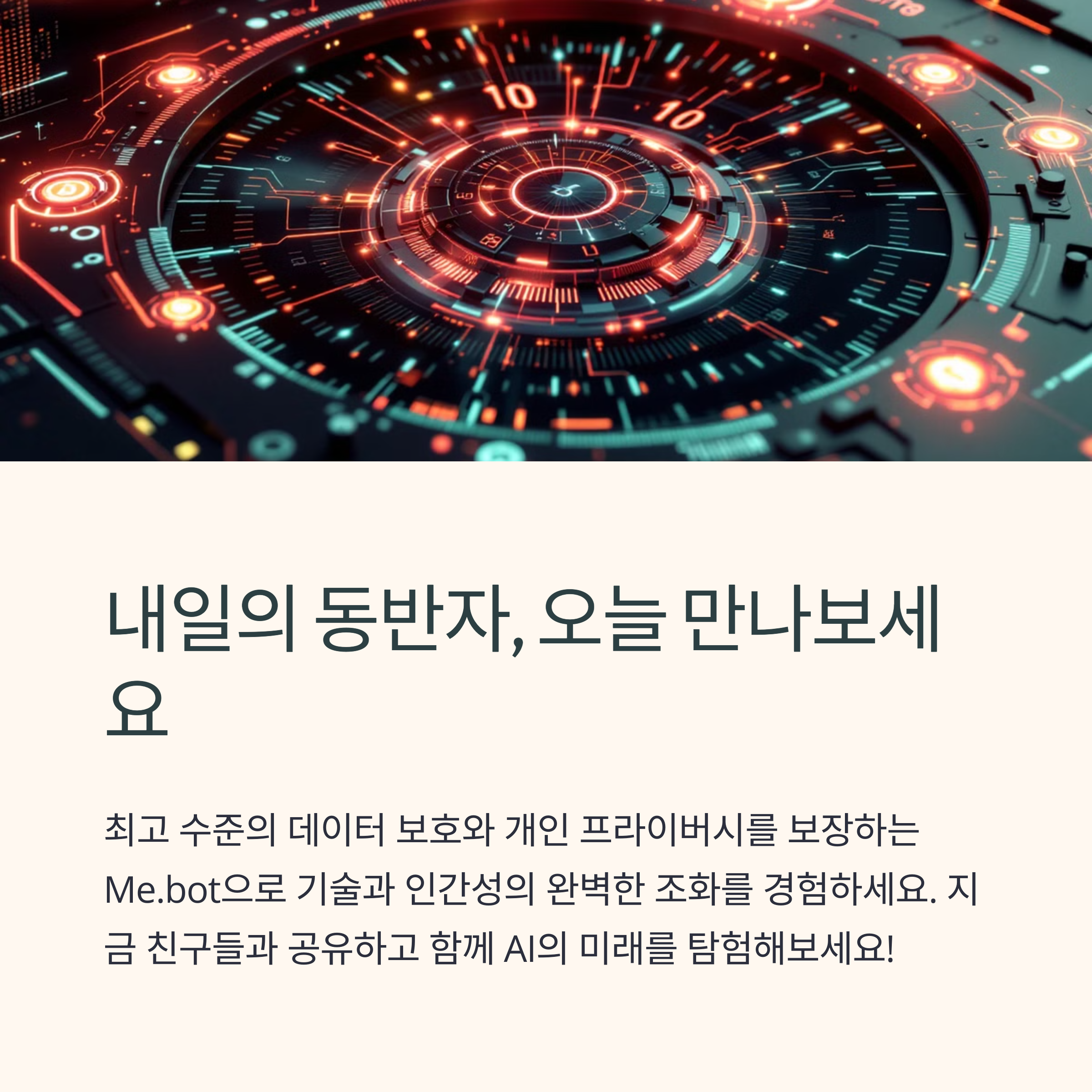 오늘은 Me.bot이라는 아주 특별한 AI 툴에 대해 이야기해봤어요. 단순한 비서가 아니라, 인생의 동반자처럼 나를 이해해주고 성장시키는 친구 같은 존재라는 느낌, 정말 소중하더라고요. 아직 경험해보지 않았다면, 꼭 한 번 시작해보세요! Me.bot이 여러분의 삶에 가져다줄 놀라운 변화를 직접 느껴보셨으면 좋겠어요. 혹시 사용해보신 분들 있다면, 여러분만의 Me.bot 이야기도 댓글로 들려주세요. 우리, 함께 더 멋진 삶을 만들어봐요! 💜