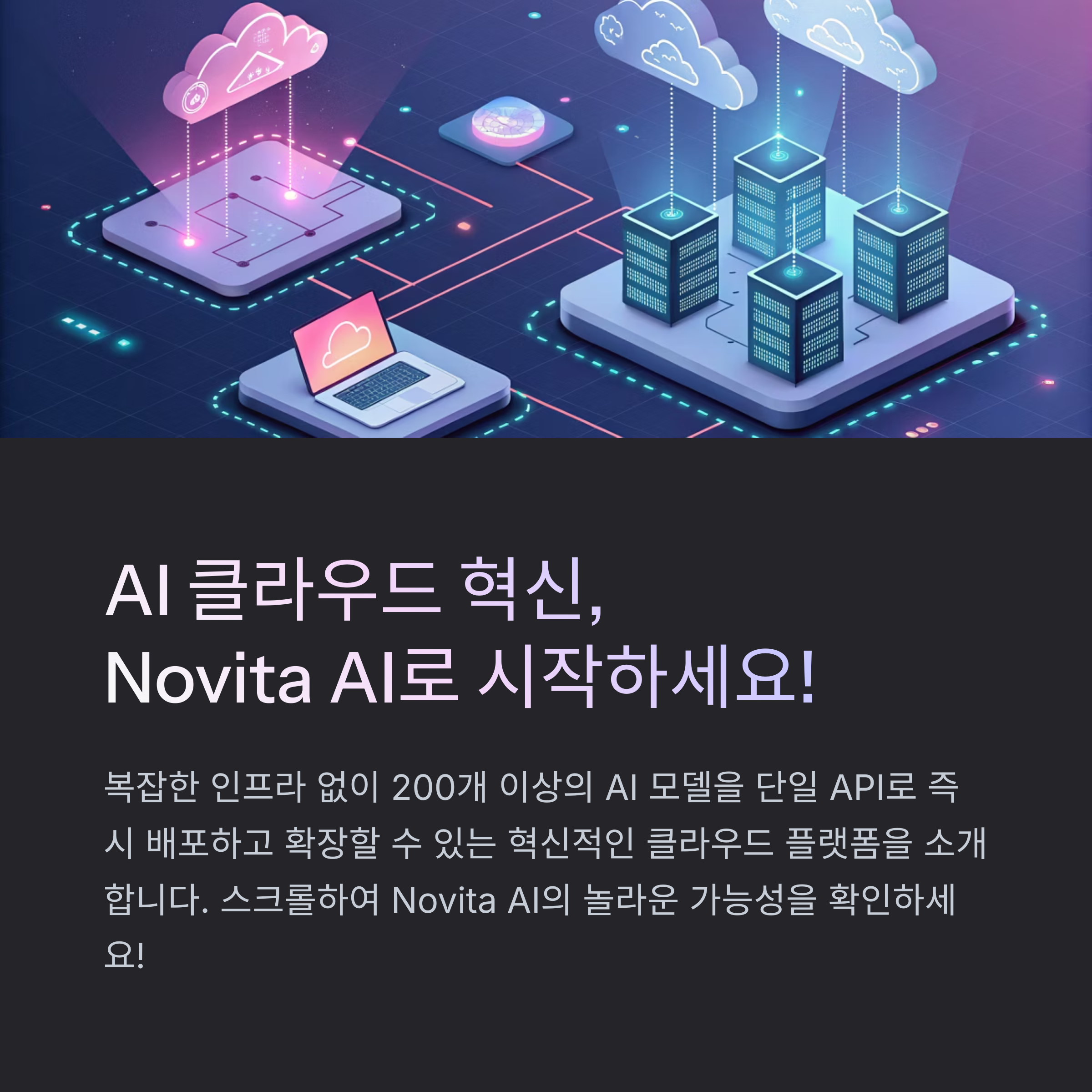 Novita AI는 복잡한 인프라 관리 없이 누구나 손쉽게 AI 모델을 배포하고 확장할 수 있는 최적의 솔루션을 제공합니다. 특히 빠른 AI 서비스 론칭과 확장, 비용 효율성 및 글로벌 경쟁력을 모두 갖춘 이 플랫폼은, 스타트업부터 대기업, 연구기관까지 폭넓은 AI 수요를 만족시킬 수 있습니다. 지금 바로 Novita AI를 통해 당신의 AI 프로젝트를 혁신해 보세요!