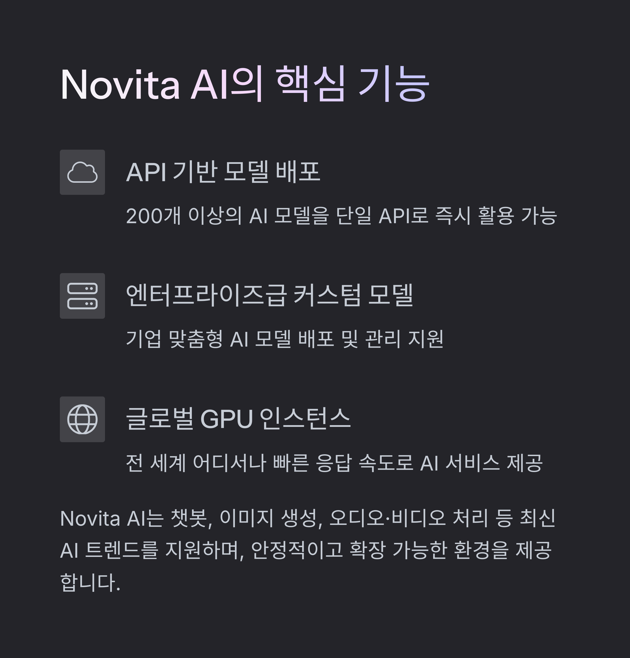 Novita AI는 복잡한 인프라 관리 없이 누구나 손쉽게 AI 모델을 배포하고 확장할 수 있는 최적의 솔루션을 제공합니다. 특히 빠른 AI 서비스 론칭과 확장, 비용 효율성 및 글로벌 경쟁력을 모두 갖춘 이 플랫폼은, 스타트업부터 대기업, 연구기관까지 폭넓은 AI 수요를 만족시킬 수 있습니다. 지금 바로 Novita AI를 통해 당신의 AI 프로젝트를 혁신해 보세요!