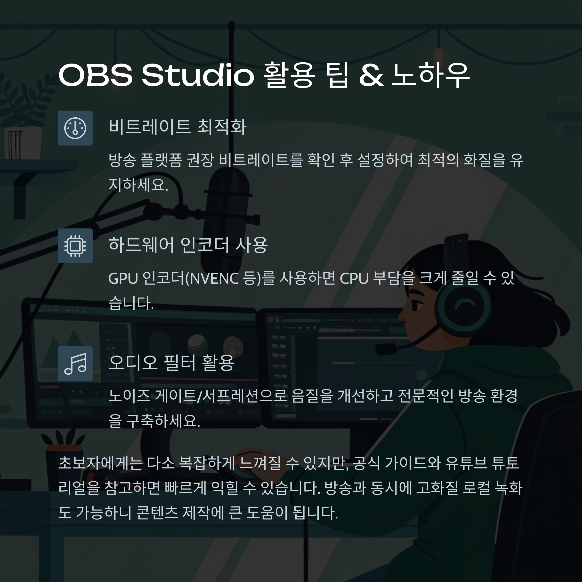 처음 OBS Studio를 설치하고 나면 뭘 먼저 해야 할지 막막할 때가 많아요. 그래서 제가 써보면서 깨달은 몇 가지 팁과 노하우를 알려드릴게요.