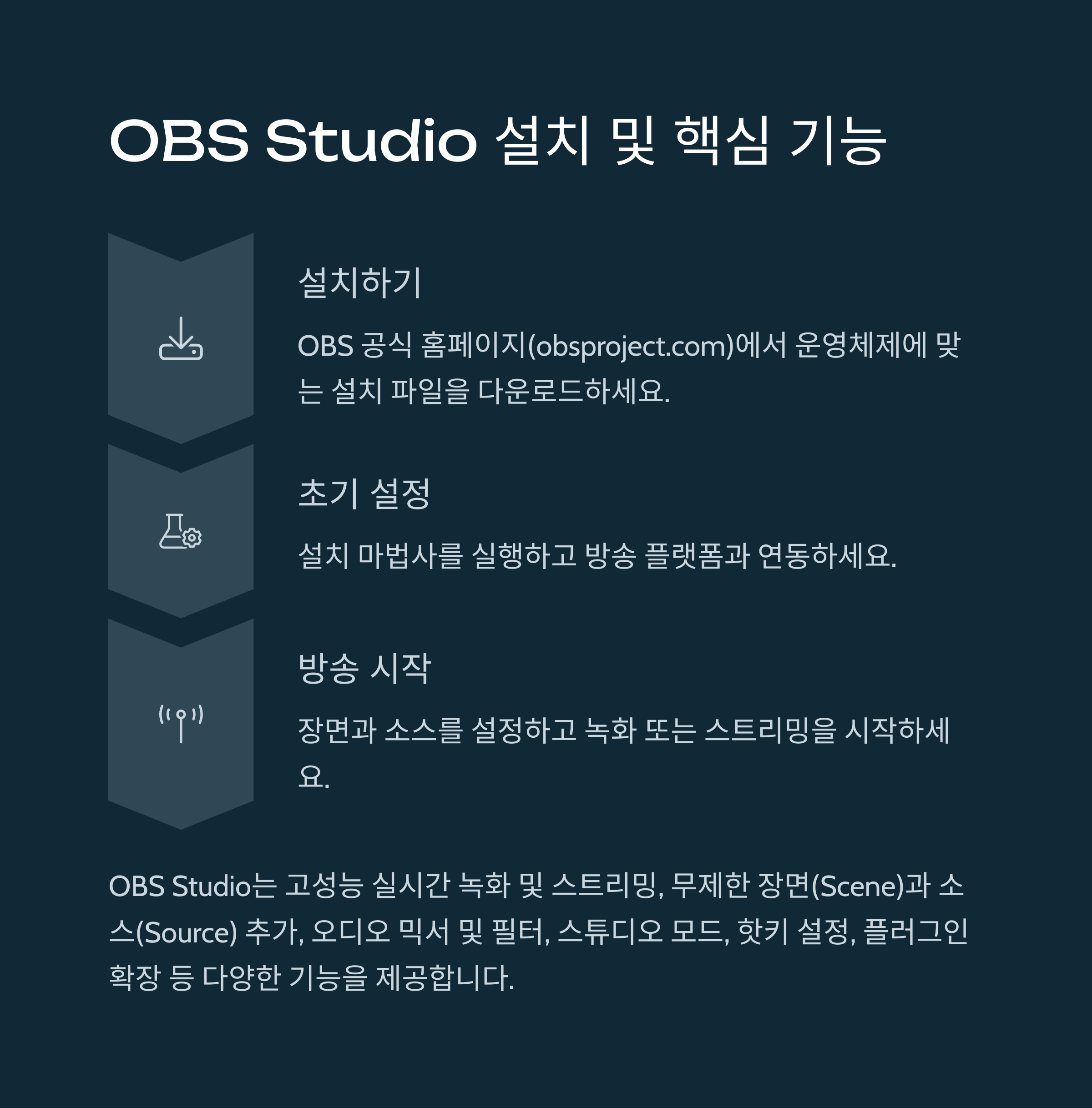 OBS Studio는 'Open Broadcaster Software Studio'의 약자로, 무료로 제공되는 오픈소스 방송 소프트웨어예요. 이름 그대로 방송과 녹화를 위한 최적화된 기능을 갖추고 있죠. Windows, macOS, Linux 등 다양한 운영체제를 지원해서 누구나 쉽게 설치해서 쓸 수 있다는 것도 큰 장점이에요.