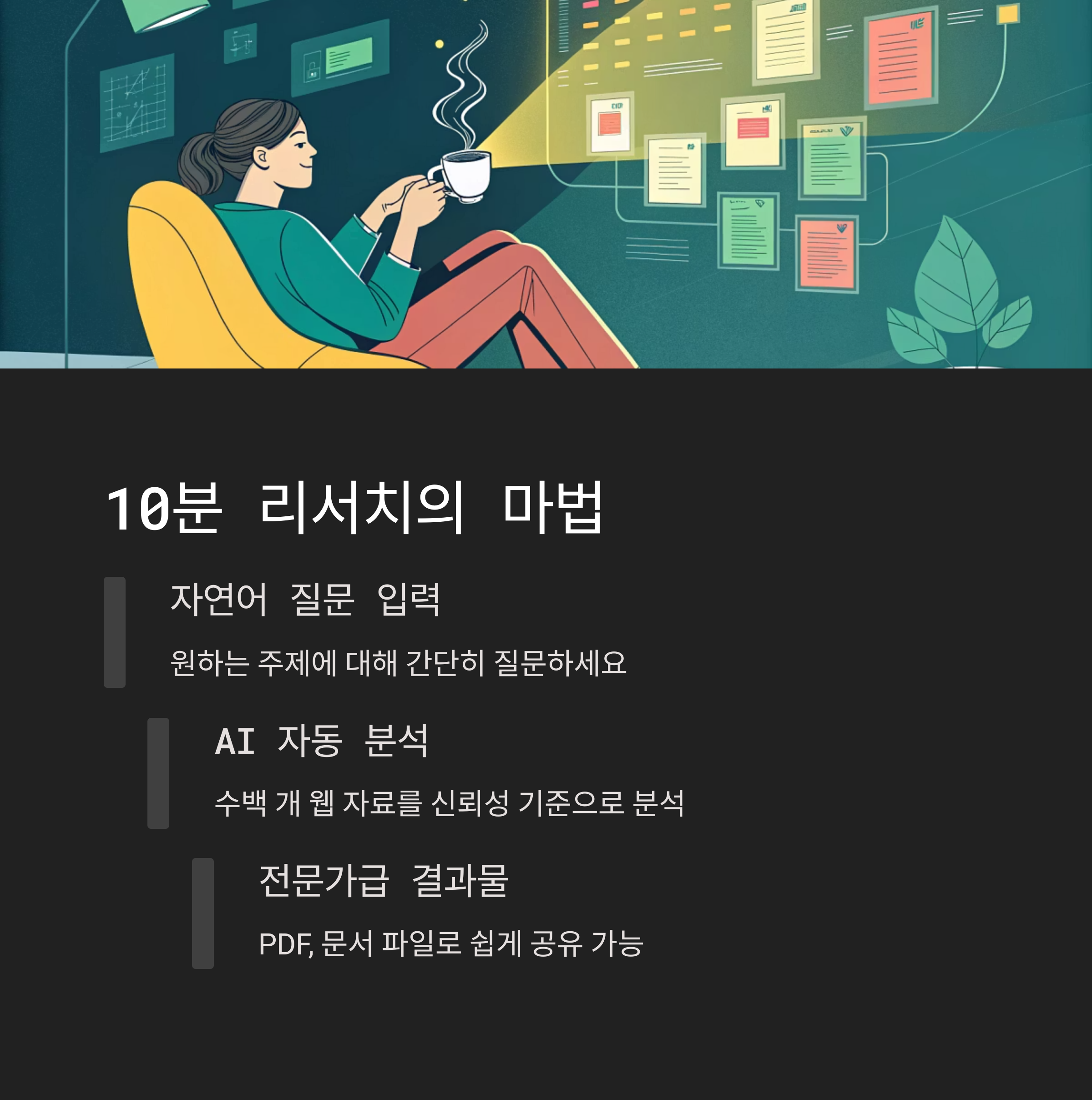 빠른 시장 조사, 경쟁사 분석, 논문 조사, 새로운 트렌드 파악 등에 매우 유용합니다. 시간이 부족할 때 전문가 수준의 인사이트를 얻고 싶을 때 적극 추천드려요.