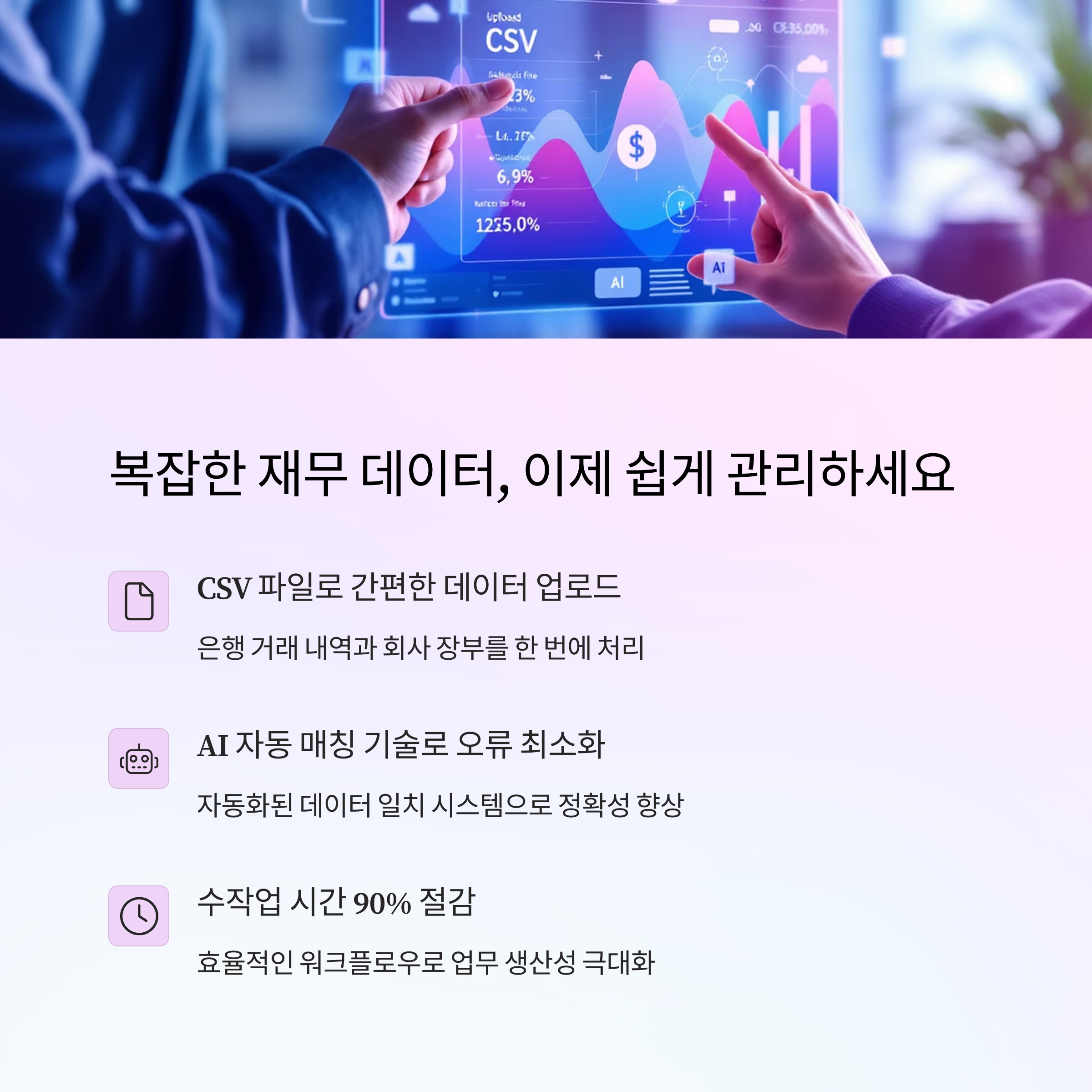 | 1. 데이터 업로드 | 은행 거래 내역과 장부 파일(CSV)을 업로드합니다. |