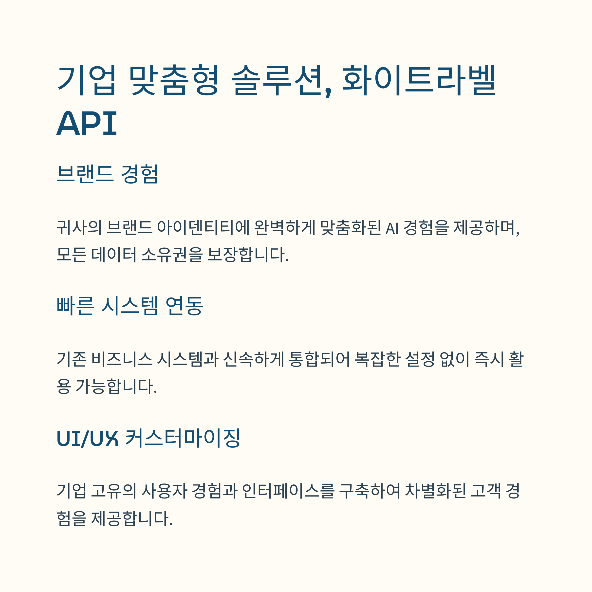 | 화이트라벨 API | 자사 앱에 빠르게 통합 가능하며 브랜드 일체감 유지 |
