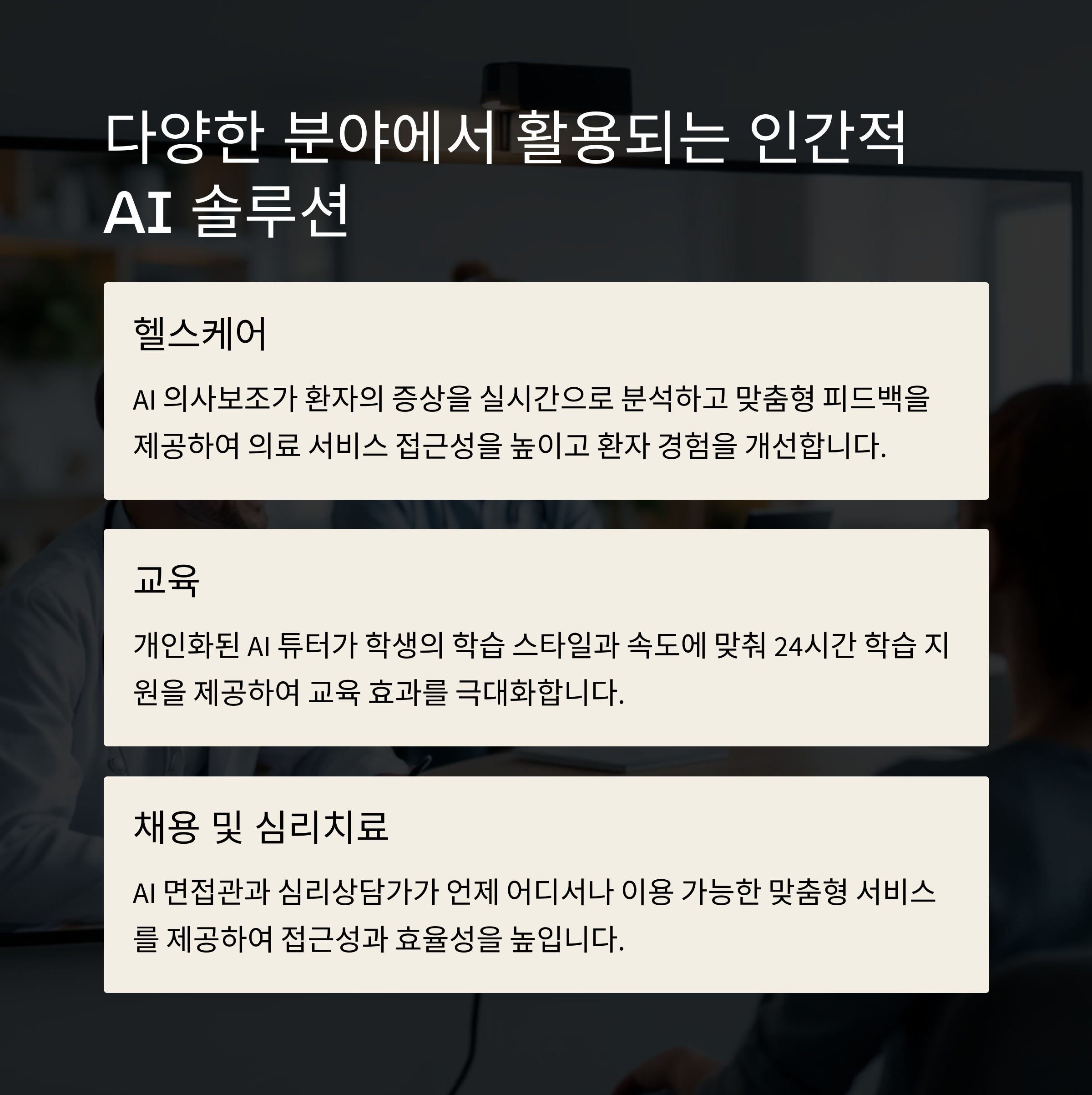 헬스케어, 교육, 채용, 코칭 등 사람과 상호작용이 중요한 모든 분야에 적용 가능합니다.