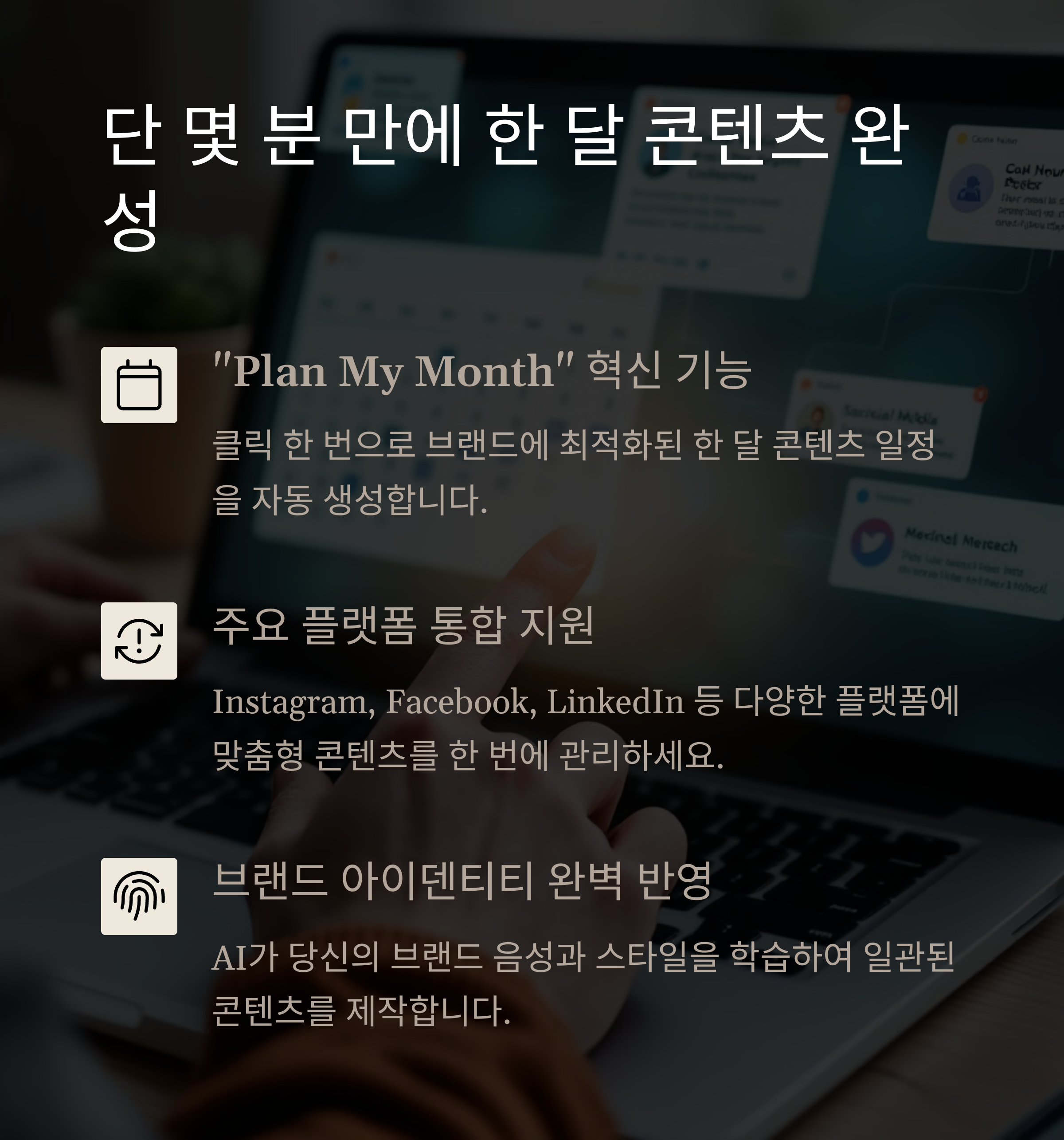 - 30일치 콘텐츠를 몇 분 만에 생성하는 "Plan My Month" 기능 제공[4][7]
