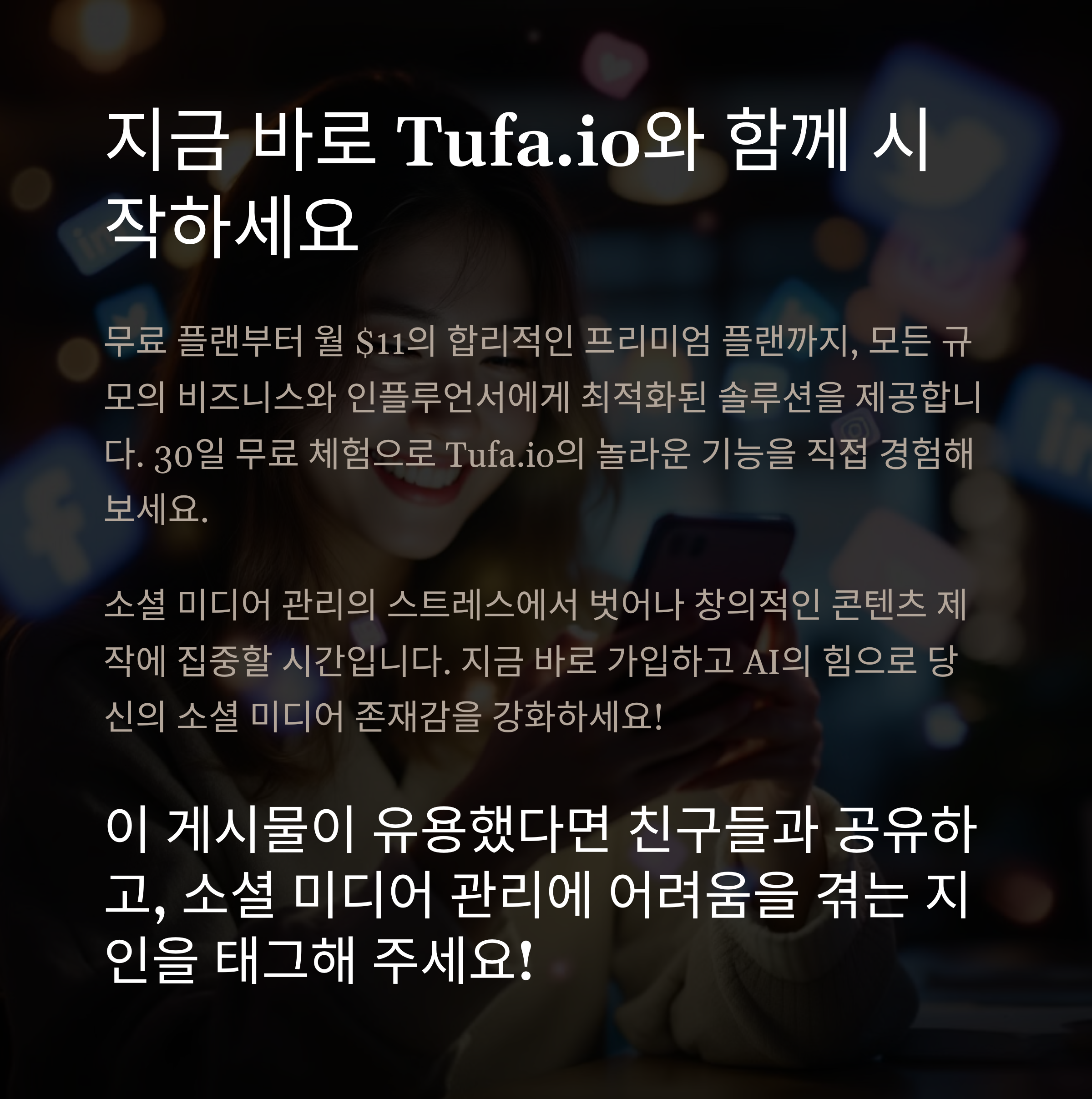 개인 브랜드를 구축하는 인플루언서는 Tufa.io를 통해 일관된 포스팅과 높은 참여도를 유지하며 팔로워와의 관계를 강화할 수 있습니다[6][8].